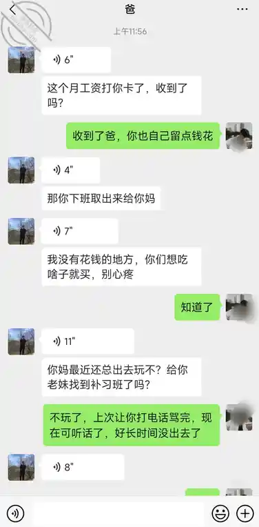 我爸厂子压半个月工资年底开,所以都是月中开,我爸岁数大了不会弄,留的我银行卡,每天打钱,问我到账没,随便问了问我妈最近还出去耍不,听兄弟们的,我没和我爸说实话,但看他舍不得吃舍不得喝的,厂里管吃住,我爸每次都一分不留的都给我们打过来,我骗他那一刻眼睛湿润了,我终于知道一个成年人的心酸了,男人就是活该死,顶着所有生活的压力,然后让最心爱的人捅刀子,下辈子要是能选择,我肯定会选择当女人!